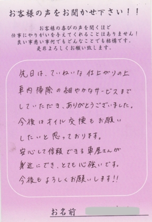 先日はていねいな仕上がりの上車内掃除の細やかなサービスまでしていただき、