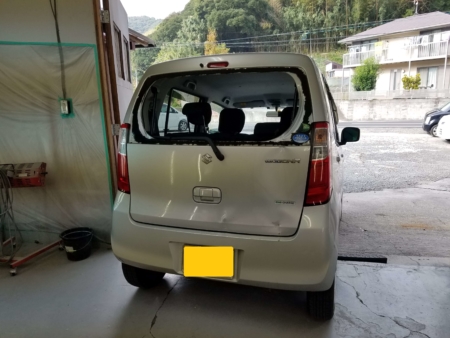 バックドアは凹んでしまって、リアガラスも割れてしまってます。