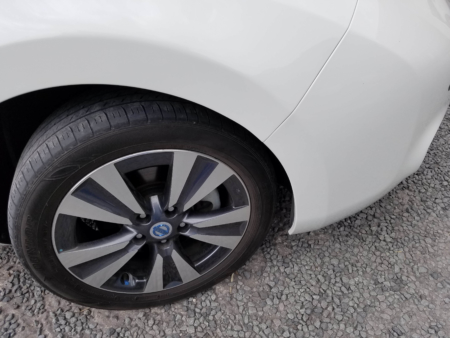日産リーフに乗ってるお客様からぶつけて凹んでしまったので持っていきます。