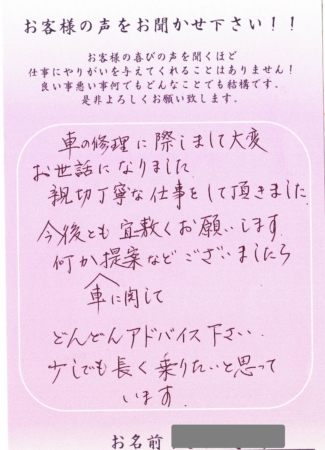 先日はマコトオートサービスで修理をしていただきありがとうございました。
