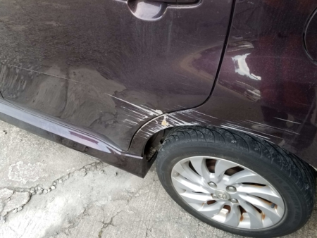 助手席側の後ろドア、リアクオーター(タイヤの上のところ)がキズが付いてへこんでいます。