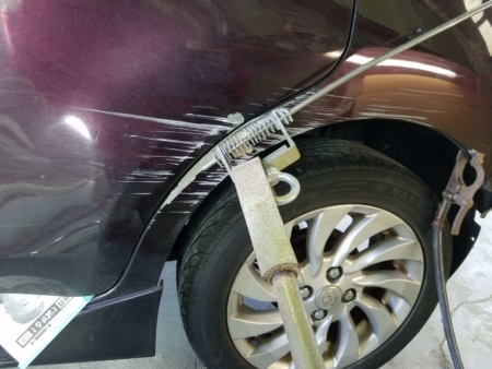 へこみがあまり大きくないところはスライドハンマーを直接鉄板に溶接します。