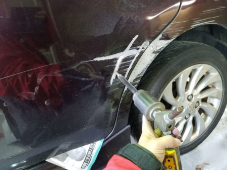 へこんでいるところの塗装をはがし、ワッシャーという道具を溶接していきます。