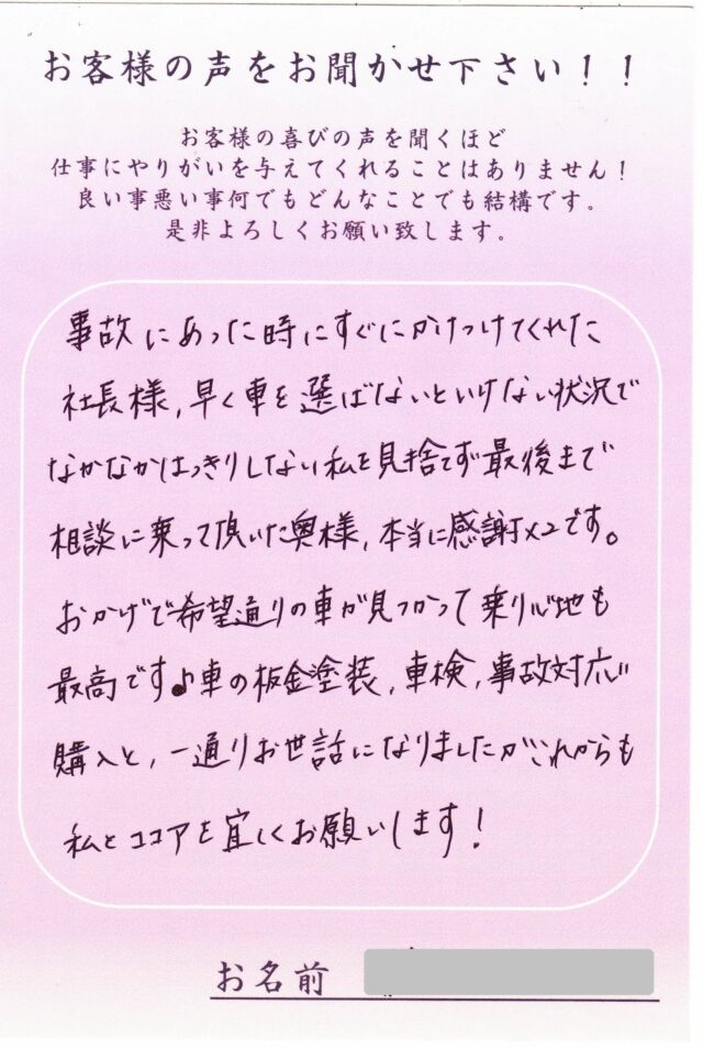 車の板金塗装、車検、事故対応購入と、一通りお世話になりましたがこれからも私とココアを宜しくお願いします!