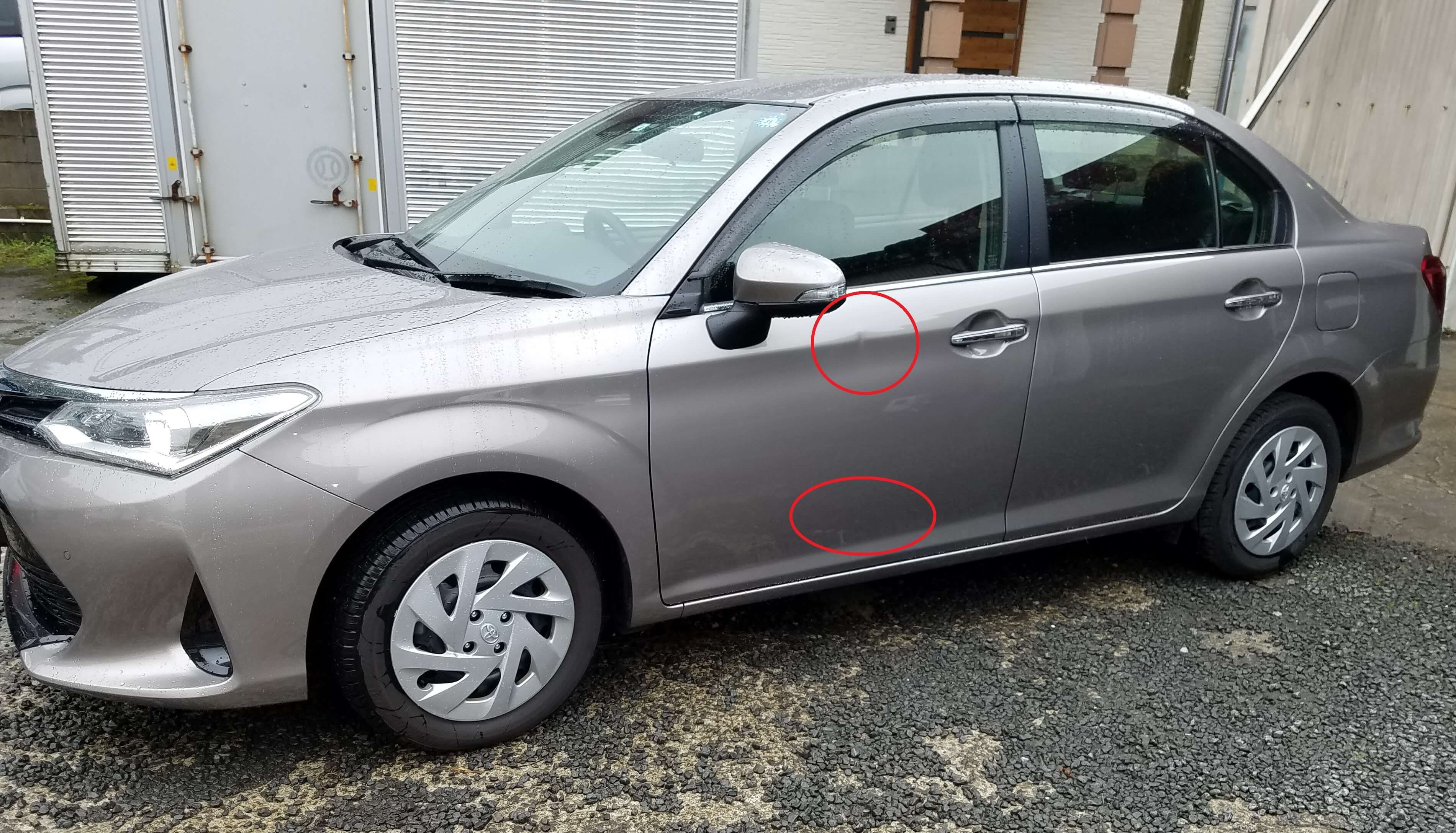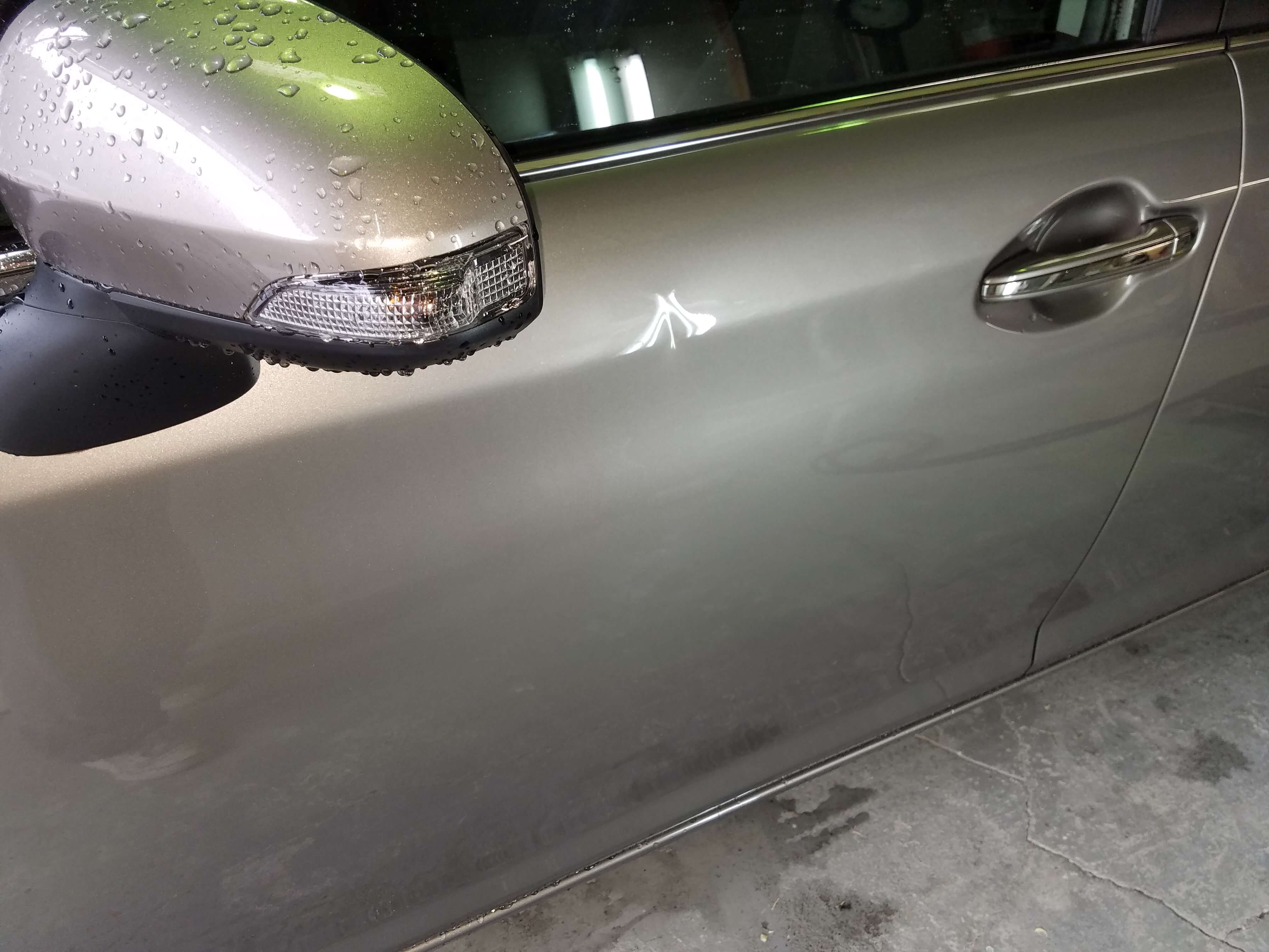 知らないうちに付いてたということでどこか駐車場で隣の人がドアを開けた時にあたったのかもしれません。