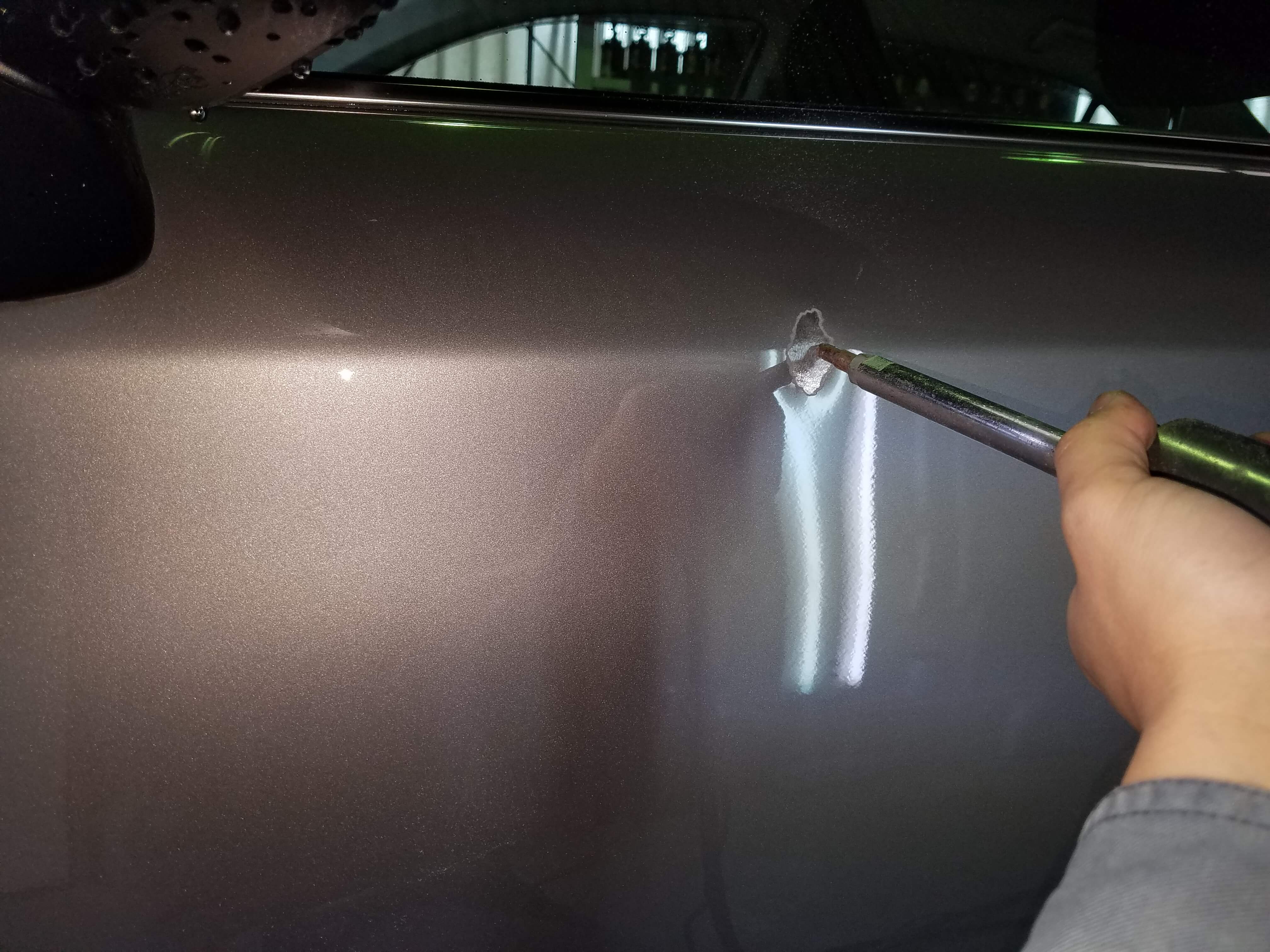 へこんでるところの塗膜をはがし、スライドハンマーという道具の先っぽを溶接します。
