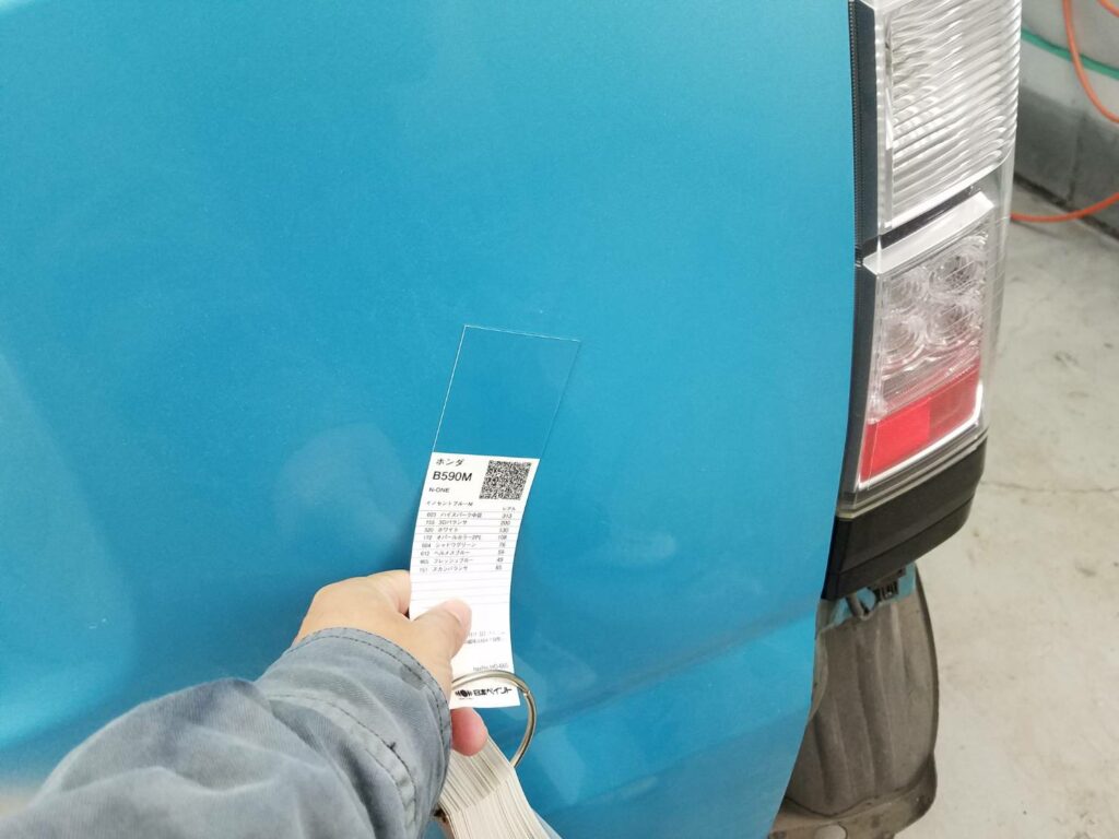 ▼カラーチェックをします。実車に近いカラーを選んで配合を調べ、当社で調色作業をおこないます。