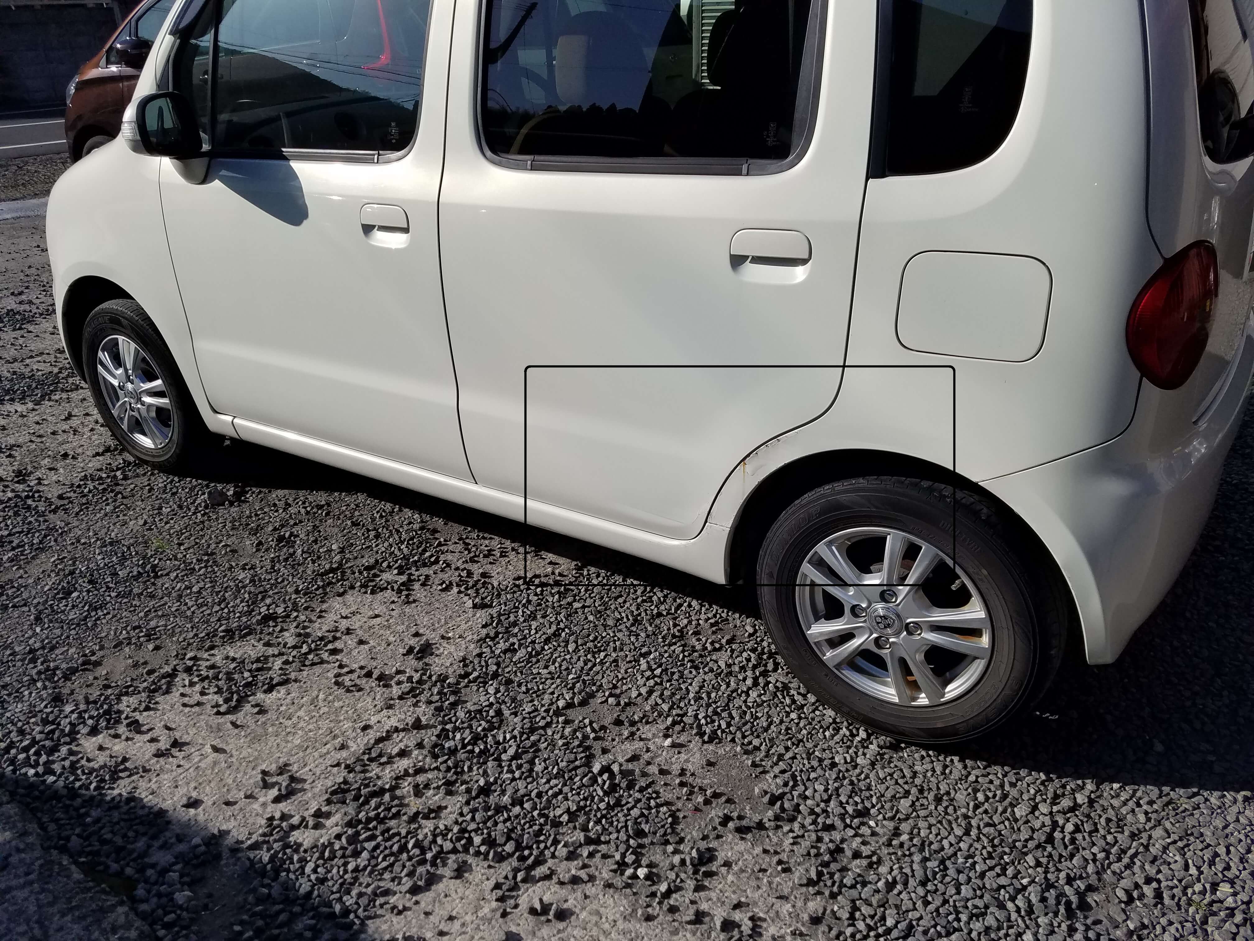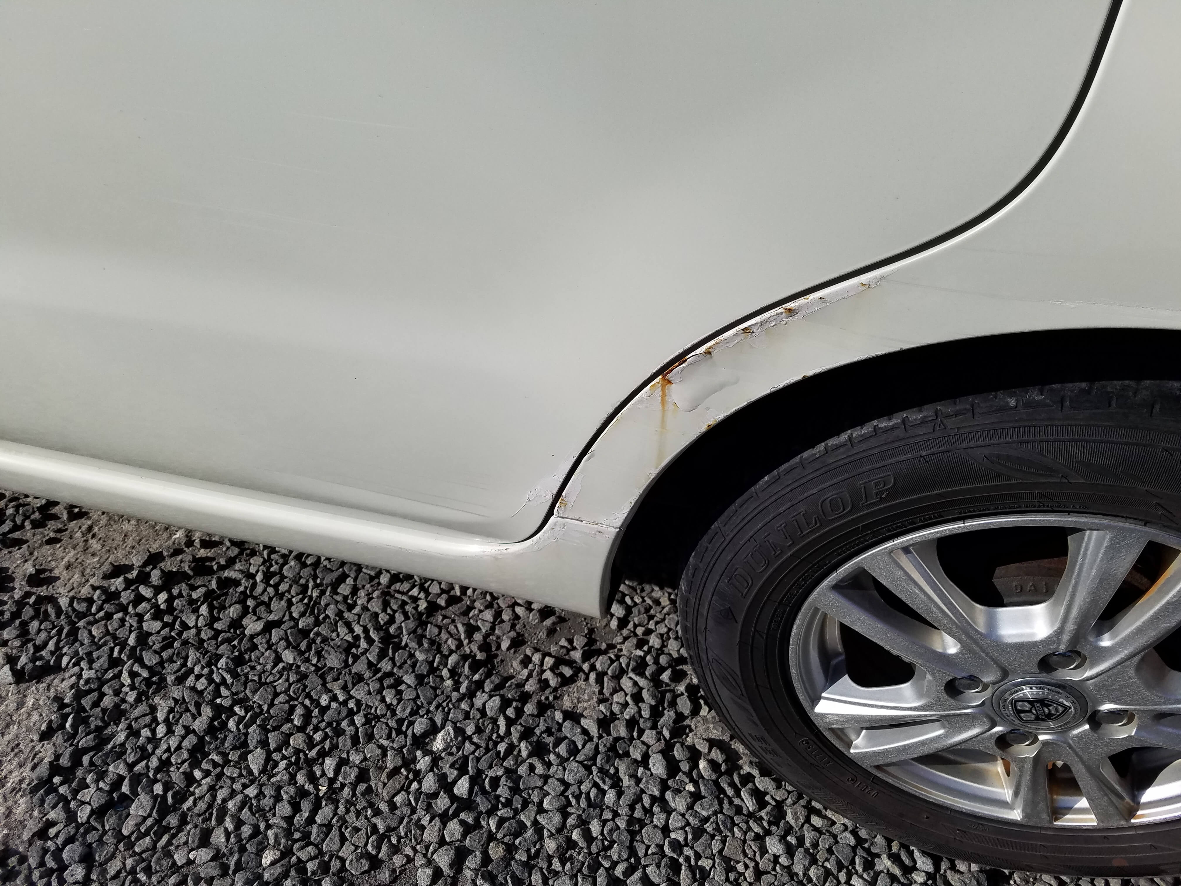 左側の後ろドア、ステップ、クオーターパネルのところをぶつけてしまってて、サビが出てきてます。