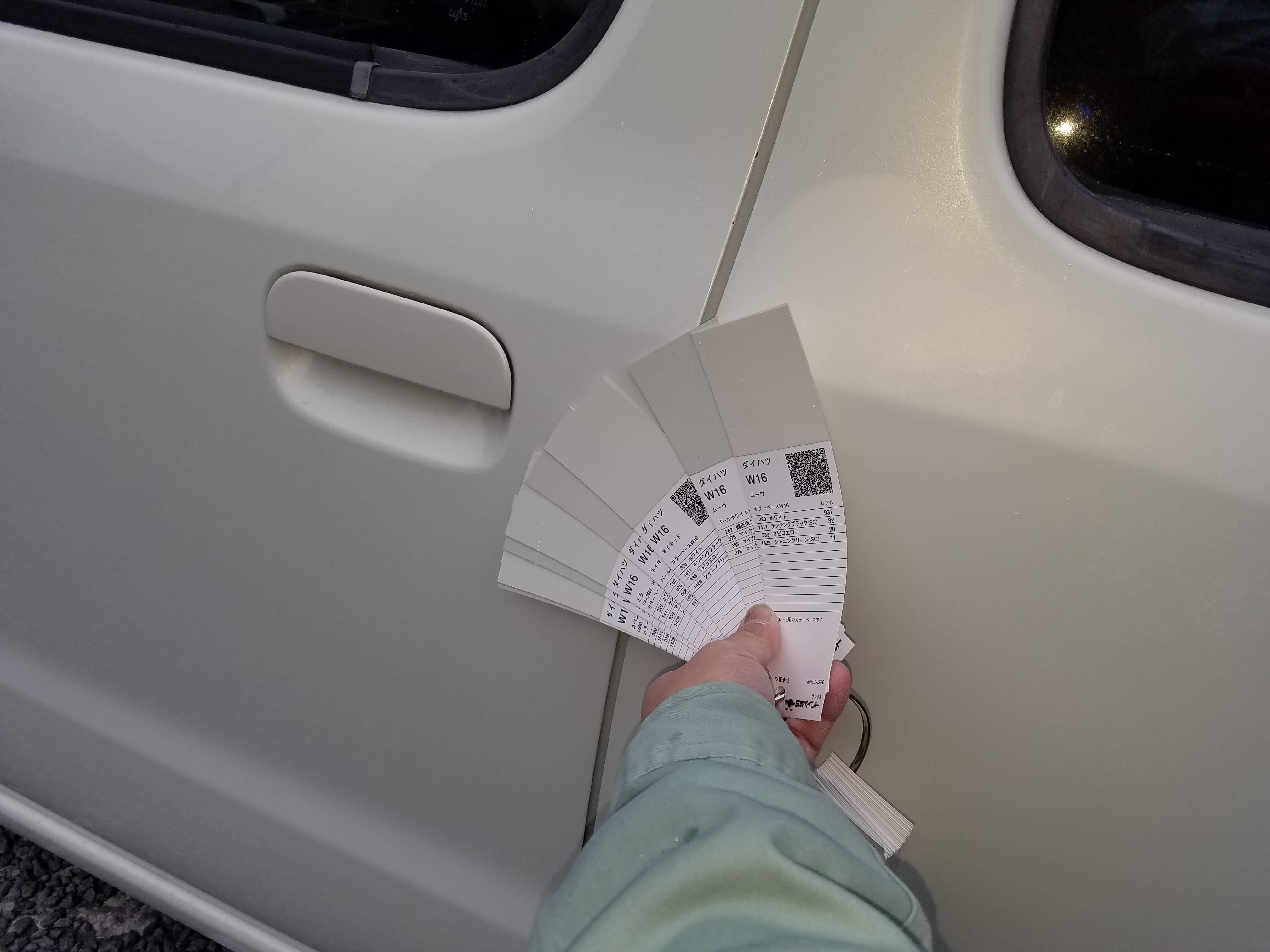 カラーの配合表を使って調色します。同じカラー番号でも何種類かあるので近いカードを使い色を作ります。
