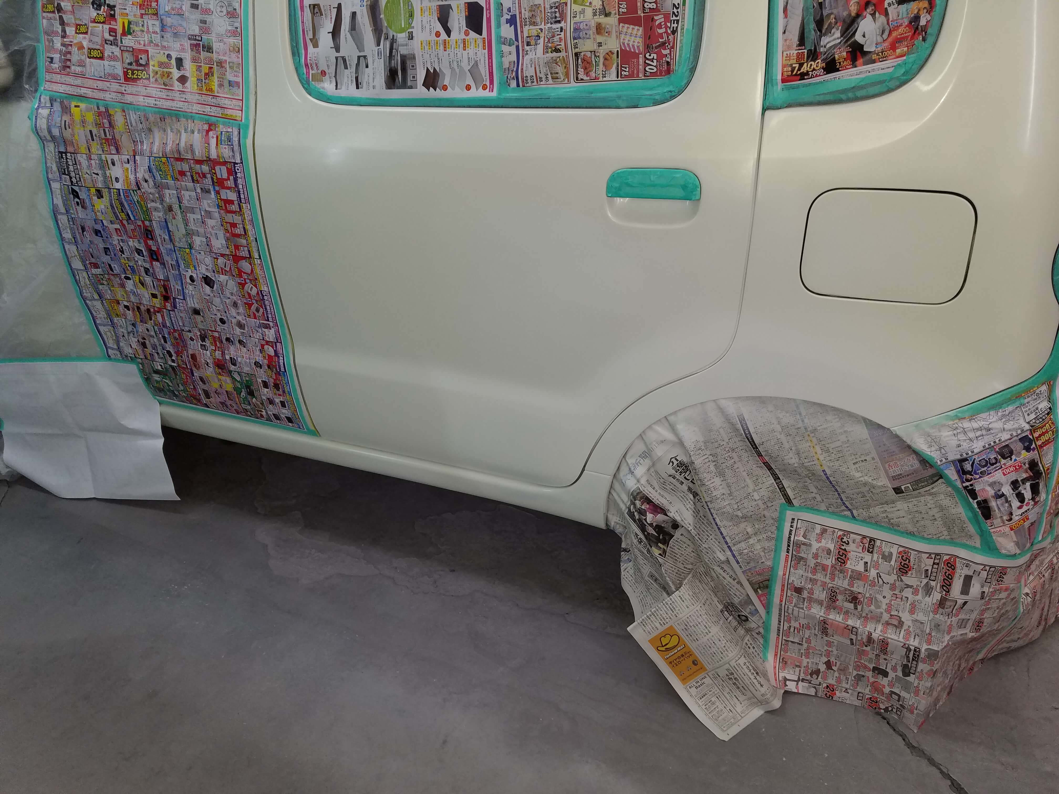 塗装室に入れて他のところに塗料が付かないようにマスキングします。