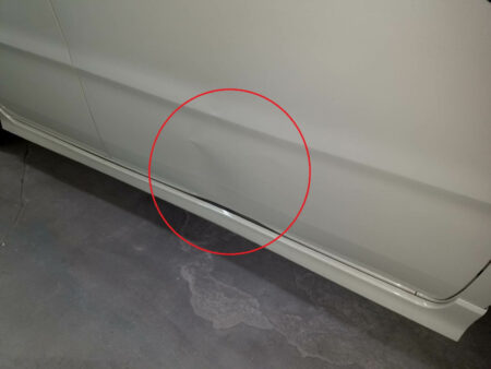 ▼損傷の様子です。ドアは同色の中古品がありましたので交換、サイドガーニッシュは新品の色付きに交換です。