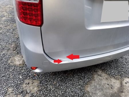 ▼ バックドアとリアバンパーに凹みが生じています。