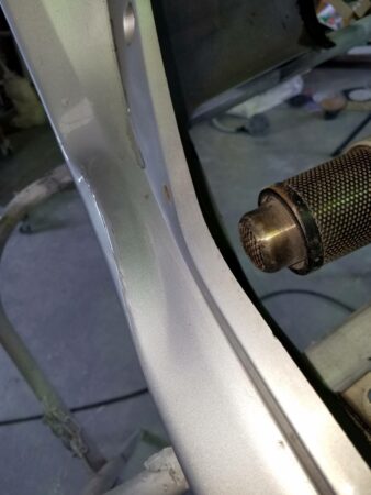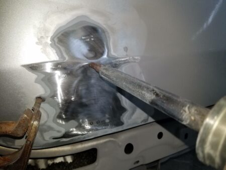 バックパネルは後ろから叩き出して修正することが出来ないので、スタッド溶接でピンを溶接し専用の治具で引きだして修正します。