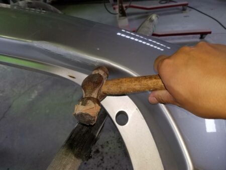 ▼ さらに、あて盤とハンマーを使って細かい部分を叩きだして修正します。