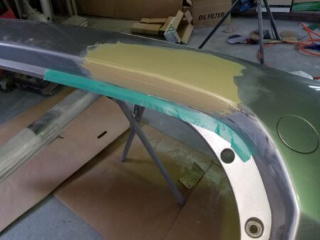また、サフェーサ塗布後に最終的な塗装面を出すために、細かいサンドペーパーで研磨する足付けを行います。